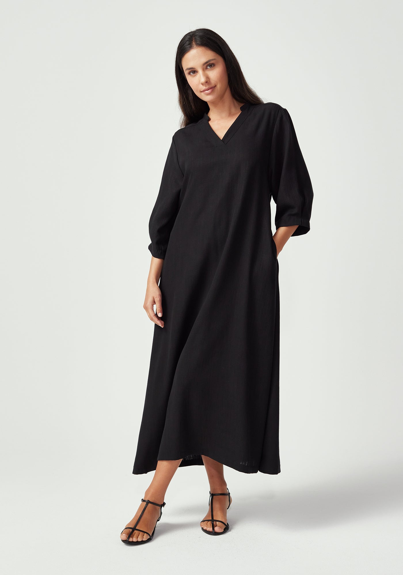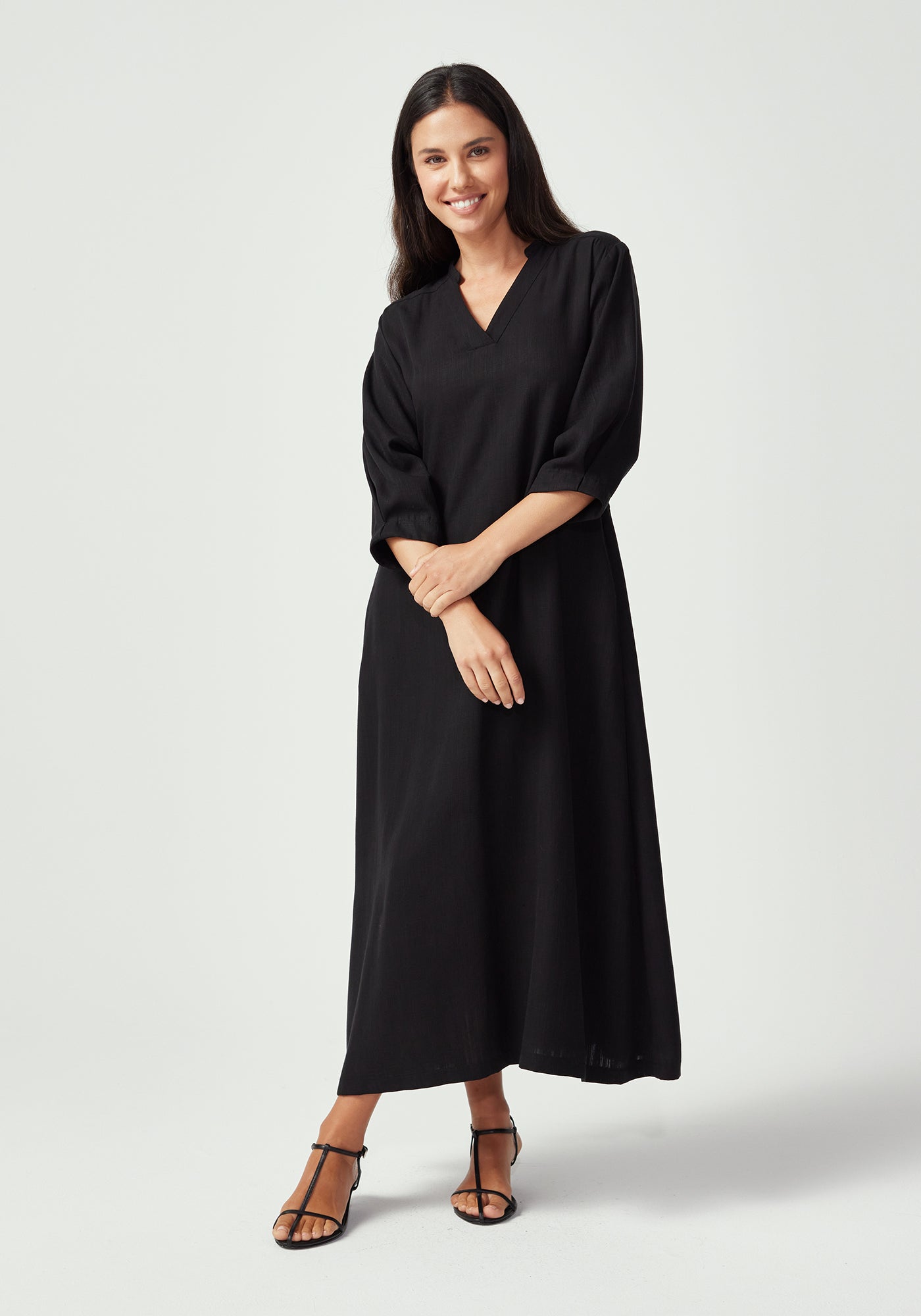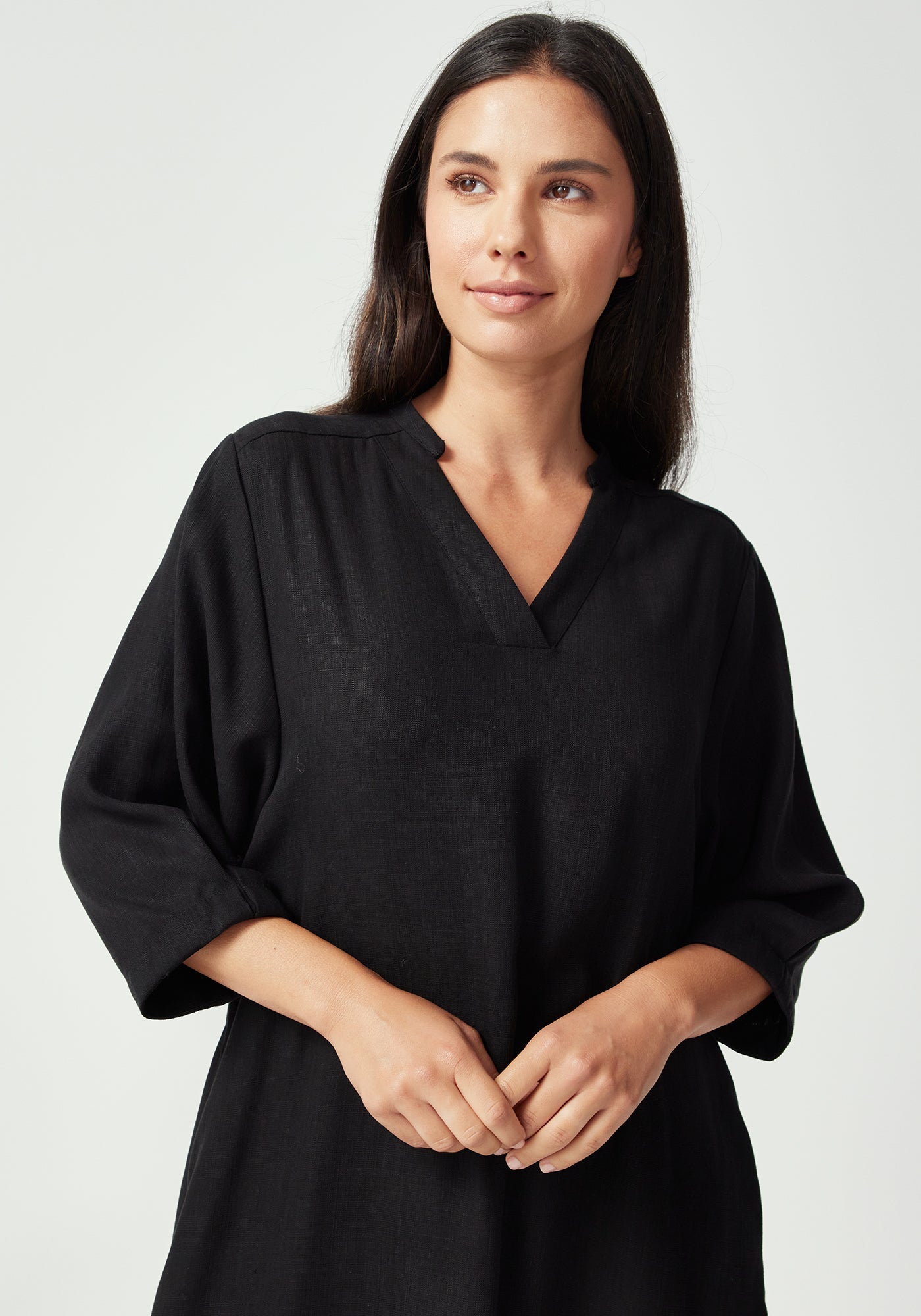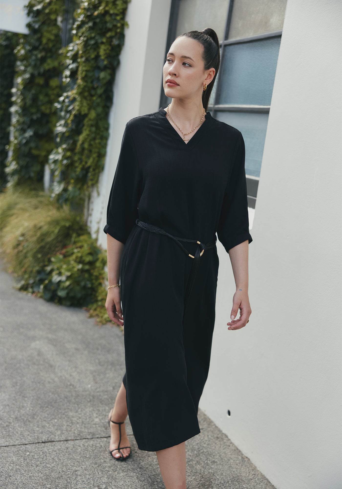 The fabric is exquisitely fine and soft with just enough stretch to make it so easy to get on and off. Drapey and also clingy in the most beautiful ways to make the fit flattering. Elegant and beautifully made. Light as a feather, cross-season garment.