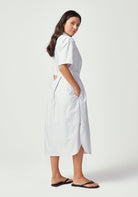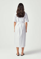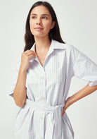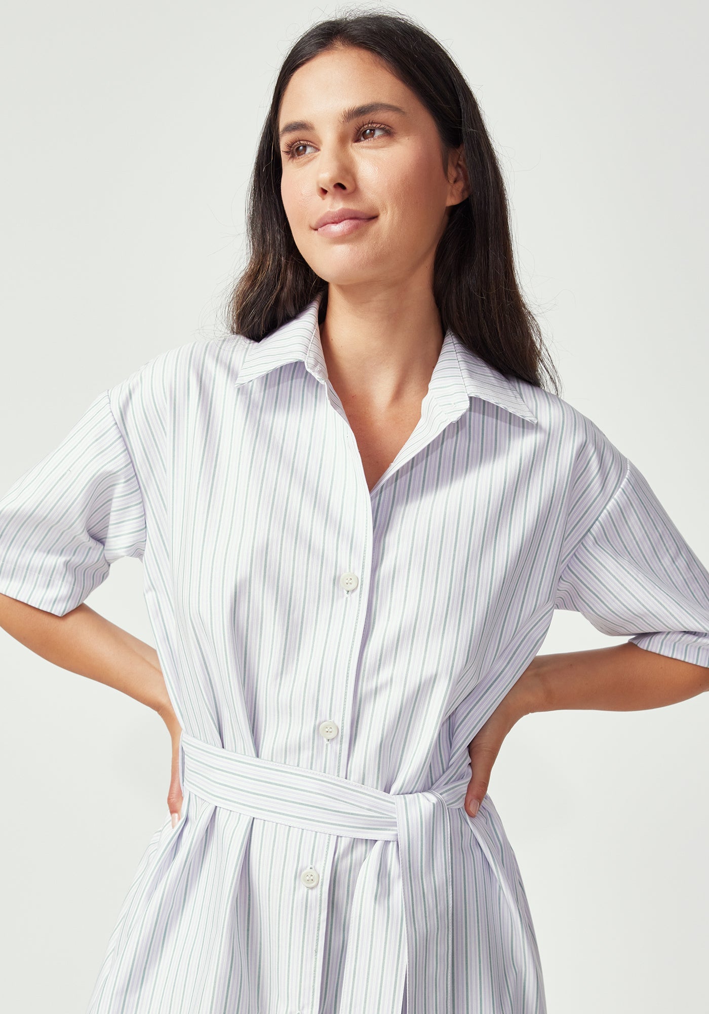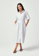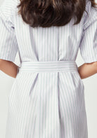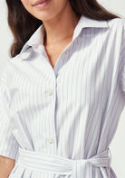 The Manon Dress embodies effortless sophistication with its clean shirt dress silhouette and thoughtful details. Featuring a classic collar, short sleeves, and full button-front closure, this midi-length dress creates a polished look that works beautifully from boardroom to brunch. The adjustable tie belt defines your waist while the relaxed fit through the body ensures all-day comfort. Practical side pockets add modern functionality to this timeless design, while the Lilac/Green Stripe brings a subtle pop of colour that offers a fresh, summer vibe.