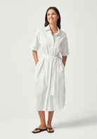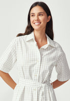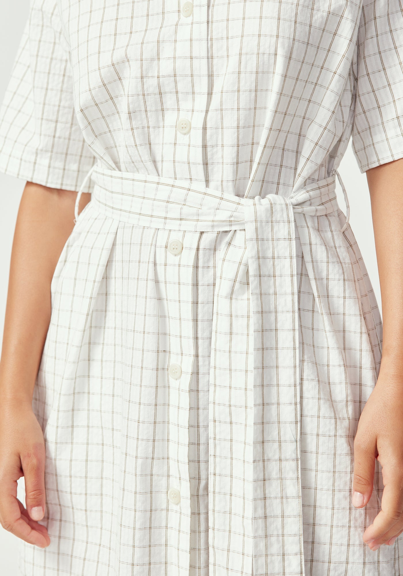 The Manon Dress elevates the classic shirt dress with a sophisticated textured check pattern. Featuring a relaxed collar, comfortable short sleeves, and full button-front closure, this midi-length piece offers versatile styling options. Wear it belted for a defined silhouette or loose for effortless ease. The practical side pockets and adjustable tie belt make this dress as functional as it is beautiful, while the crisp White/Flax Check pattern brings timeless appeal with a modern twist.