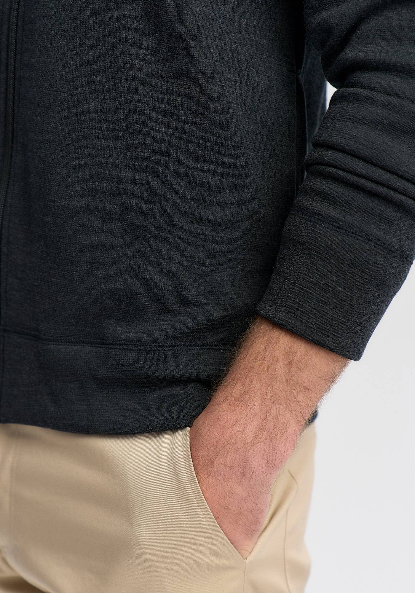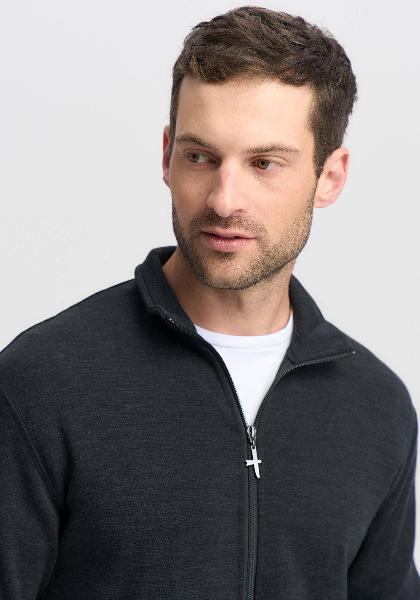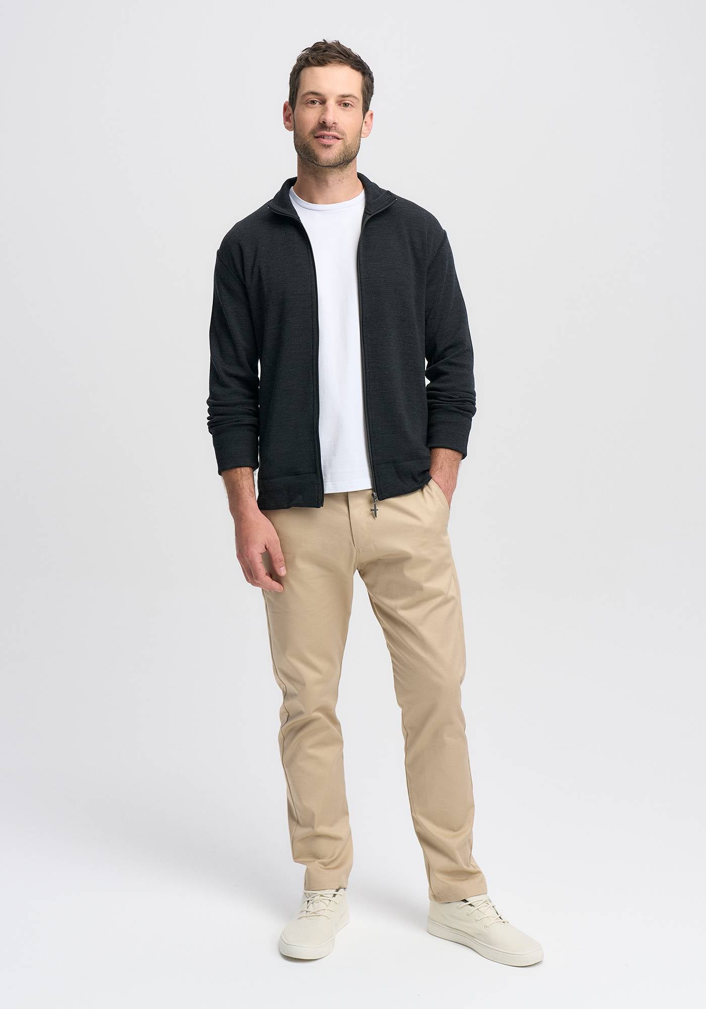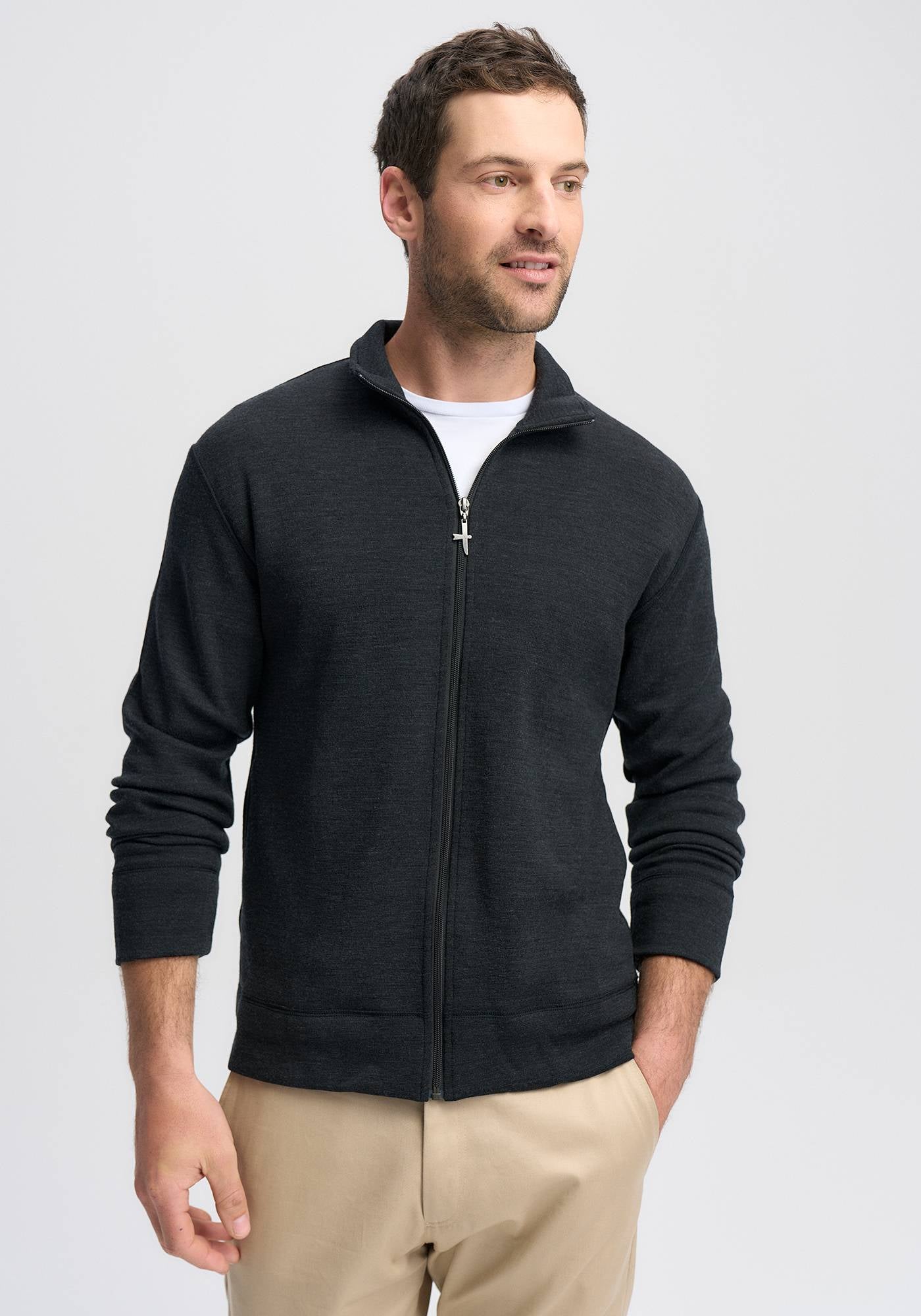 This casual zip-front 100% Merino men's jacket is another of our essential basics. Throw it on over a shirt or tee to add instant warmth and style.