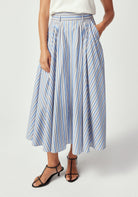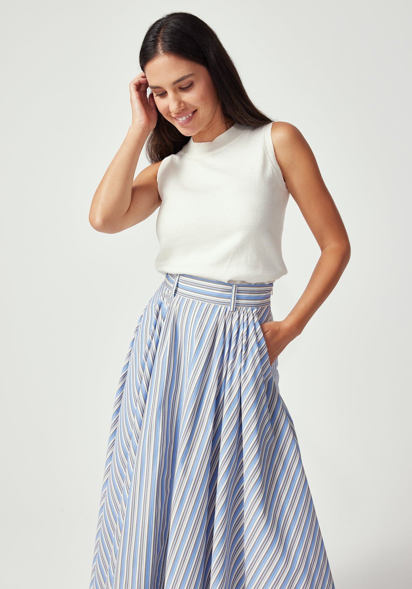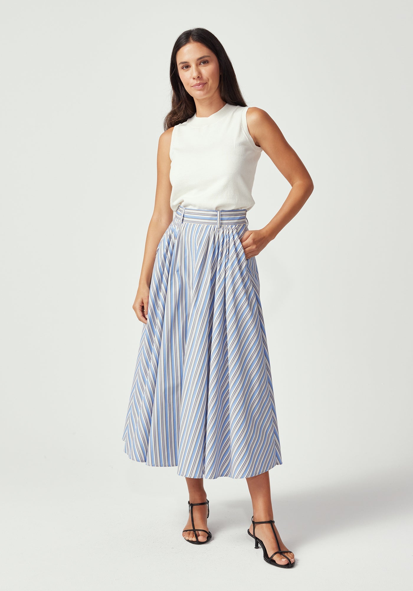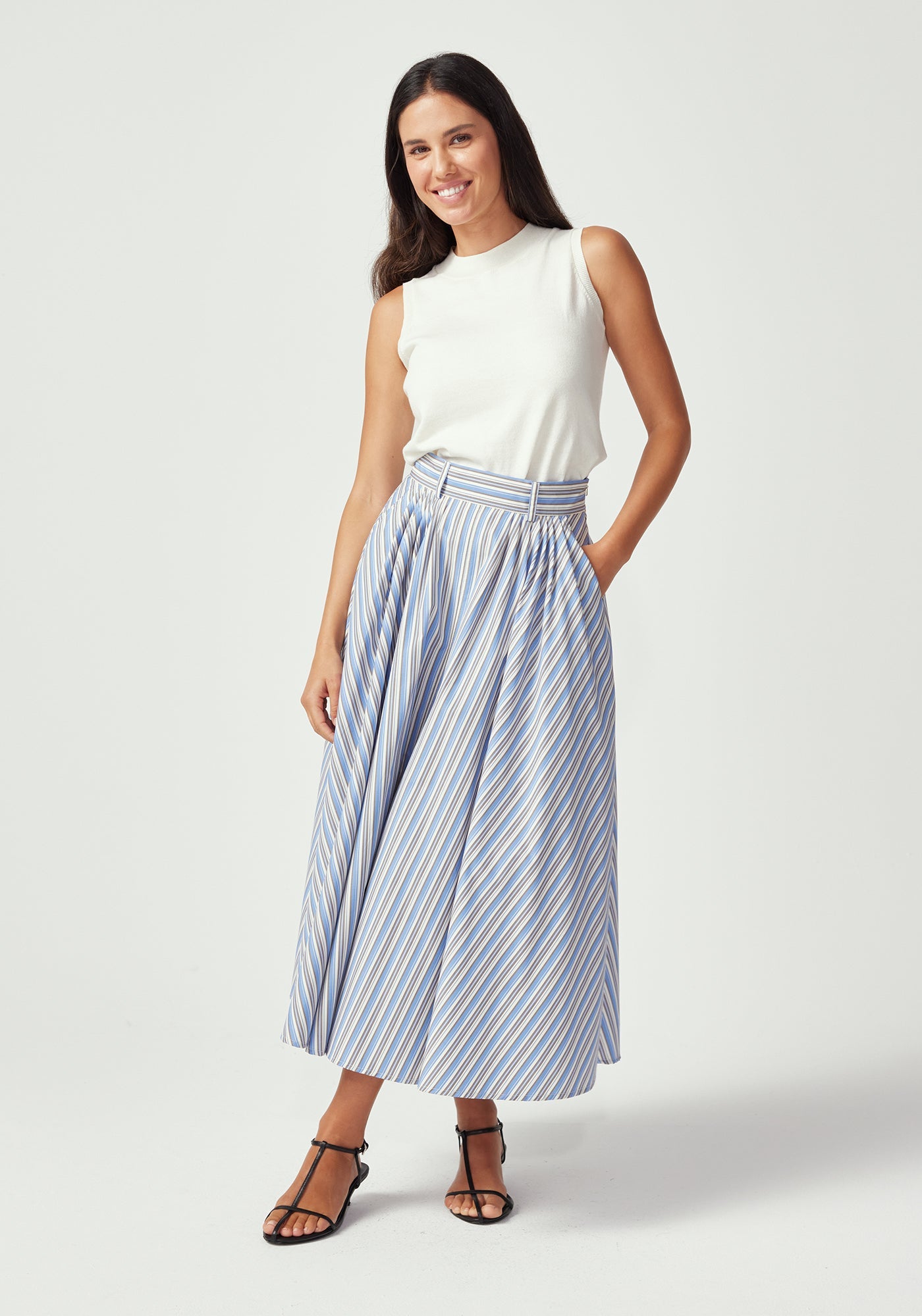 Finding the perfect balance of structure and femininity, the midi-length Gianna Skirt embodies an iconic 1950's elegance. Featuring a flattering high waist with belt loops, front pleats that create beautiful movement, and practical side pockets for modern functionality. The midi length hits at the most flattering point, making this piece equally suited for the boardroom or dressed up for a girl's night out.