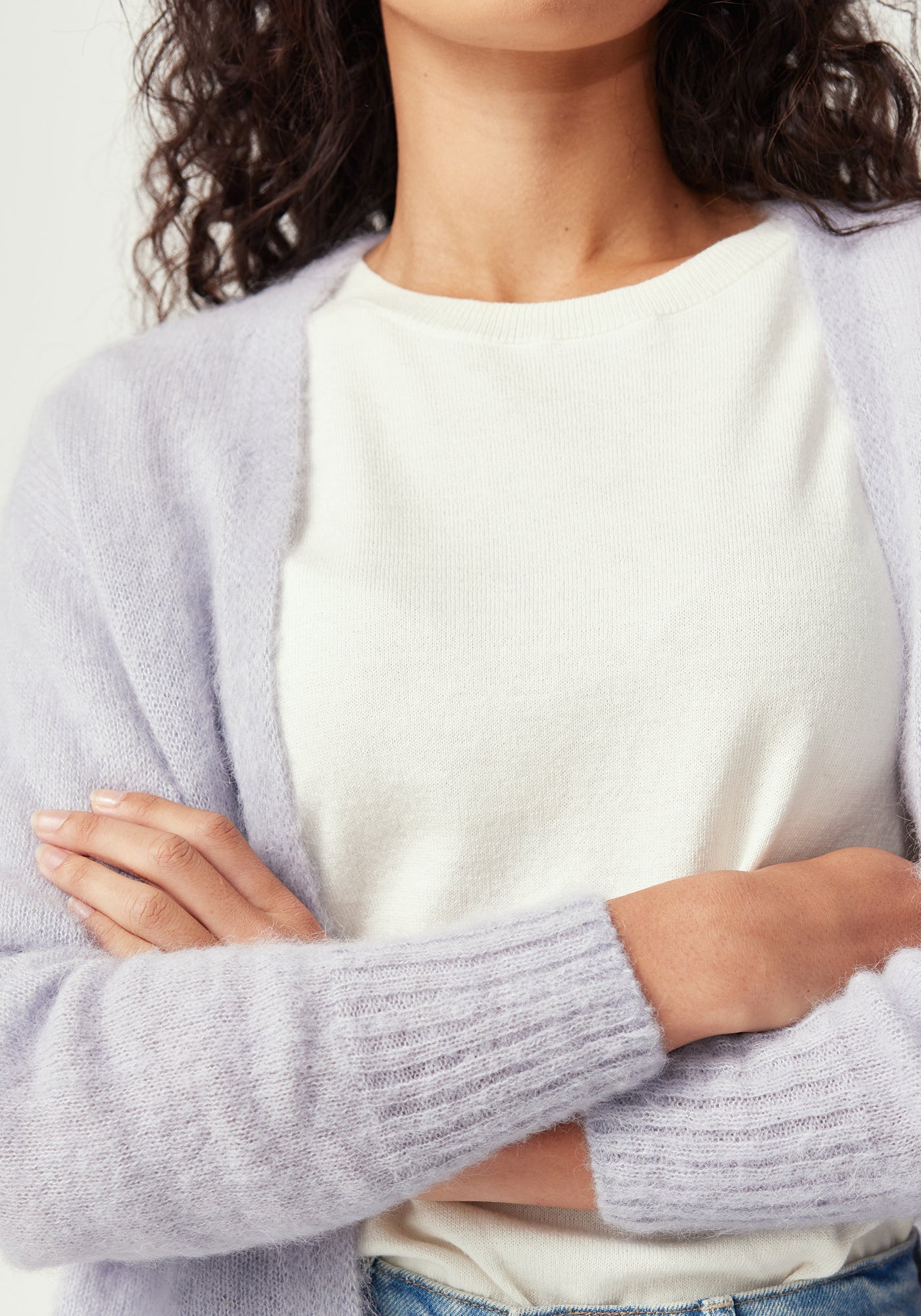 Wrap yourself in understated luxury with this effortlessly chic throw-on cardigan. This sumptuous blend creates an impossibly soft, weightless layer that will feel like you're wearing a cloud, without the bulk traditional cardigans often bring. This relaxed-fit piece is your solution to unpredictable temperatures, whether you're navigating air-conditioned offices or breezy evening walks. Perfect for pairing with everything from fitted basics to flowing dresses.