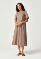 With its clean, minimalist silhouette and versatile midi length, the Nero Dress is designed for the woman who values both style and comfort. Featuring a classic crew neckline, short t-shirt style sleeves, and a relaxed fit through the body, this simple yet refined design is endlessly versatile. Wear it belted for a more defined silhouette or loose for casual elegance. Crafted from 100% Good Earth Cotton, this dress embodies our commitment to regenerative agriculture and soil health.