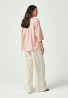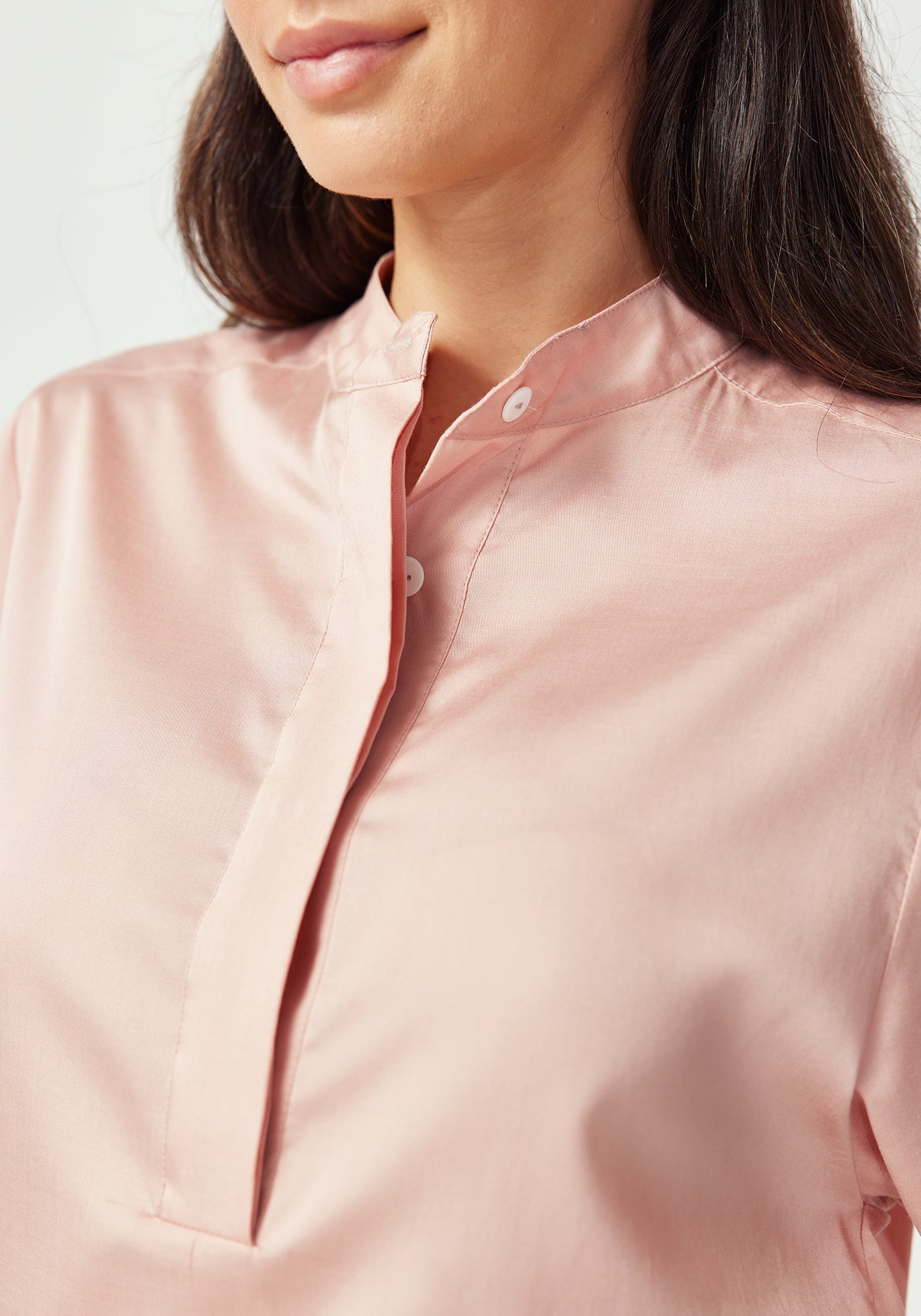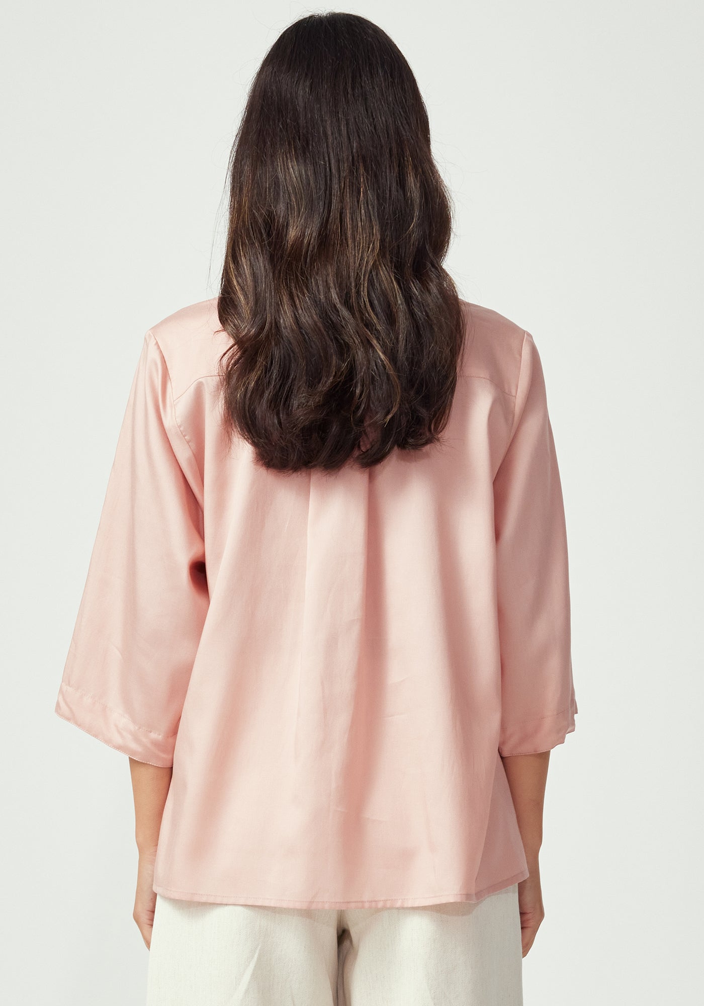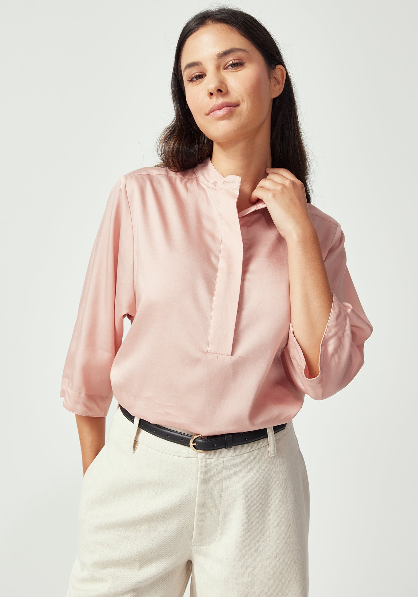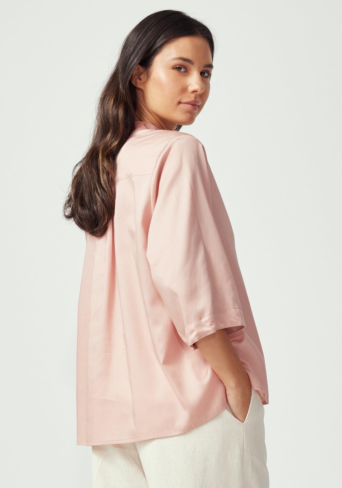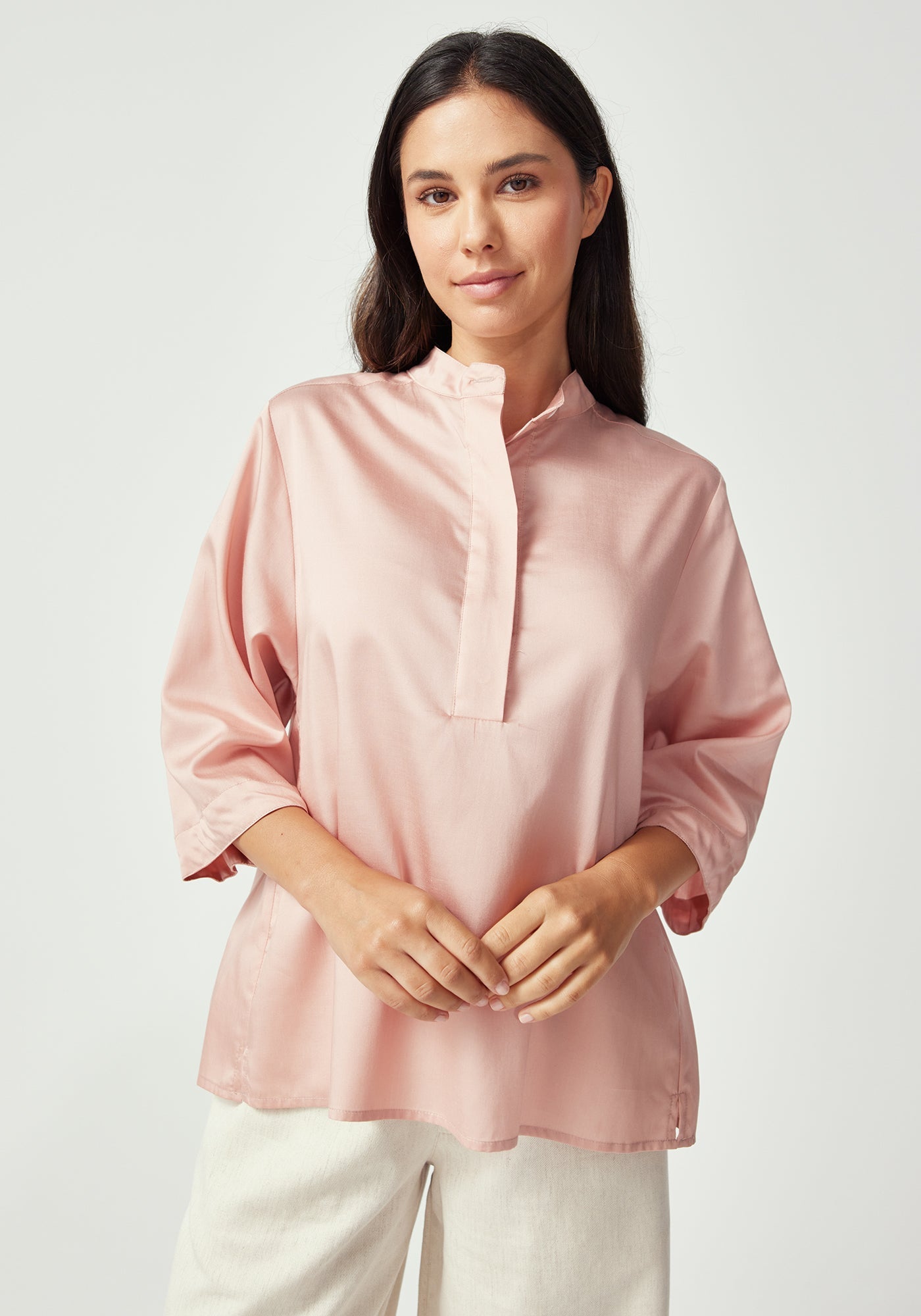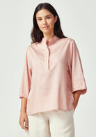 Elevate your wardrobe with this beautifully crafted shirt that combines timeless design with modern comfort. Made from a luxurious blend of 63% TENCEL™ and 37% cotton, this three-quarter sleeve piece offers the perfect balance of silky smoothness and natural breathability.