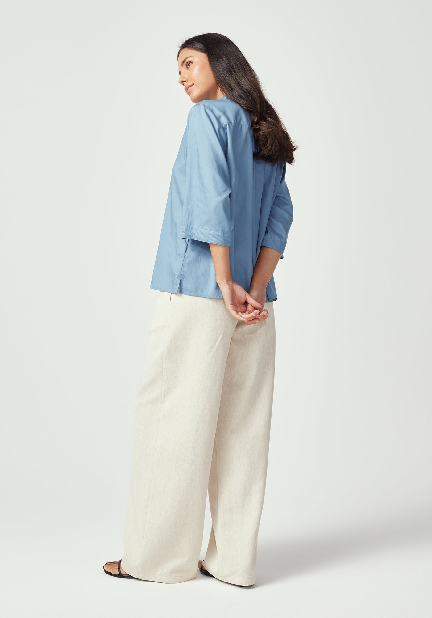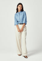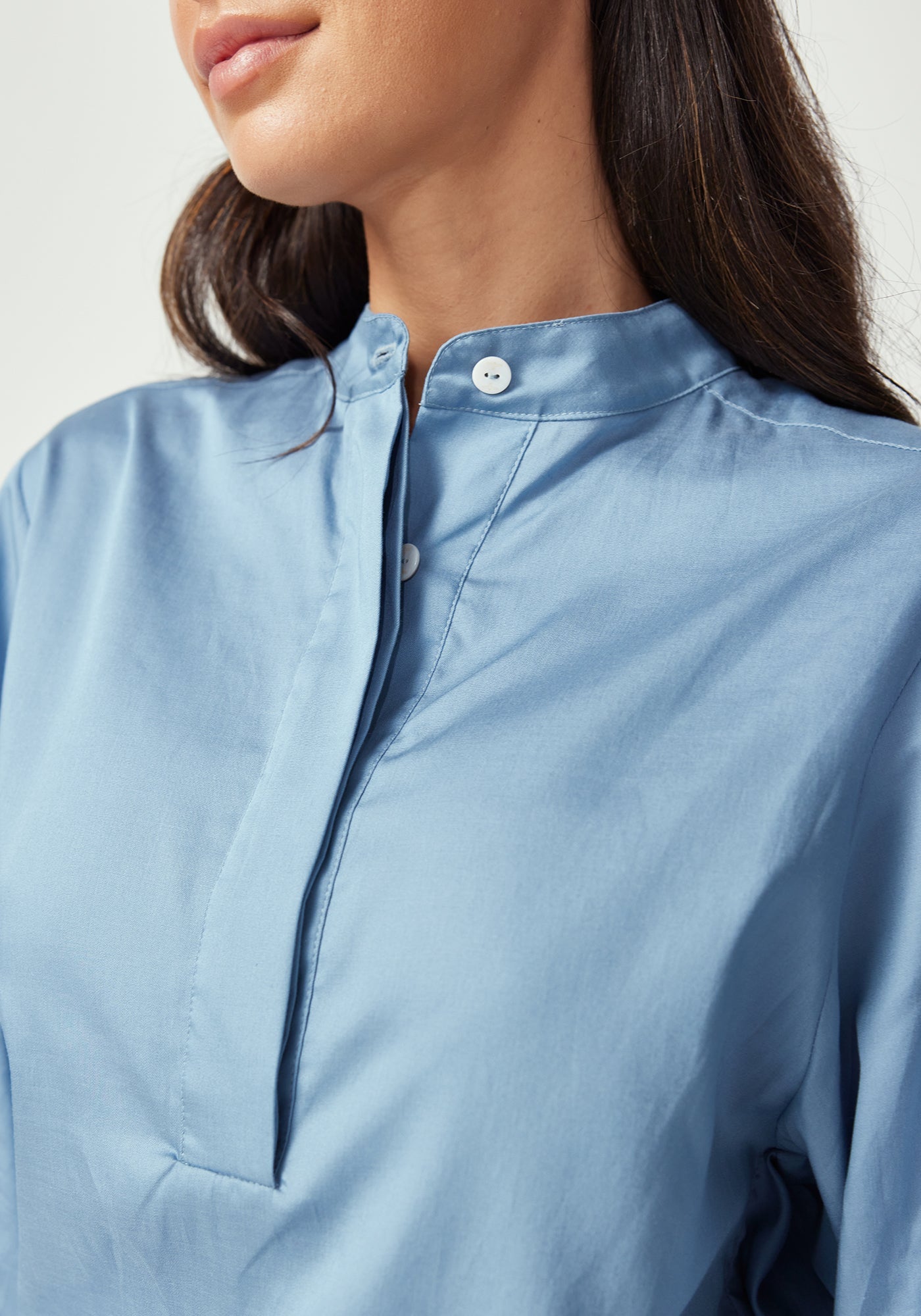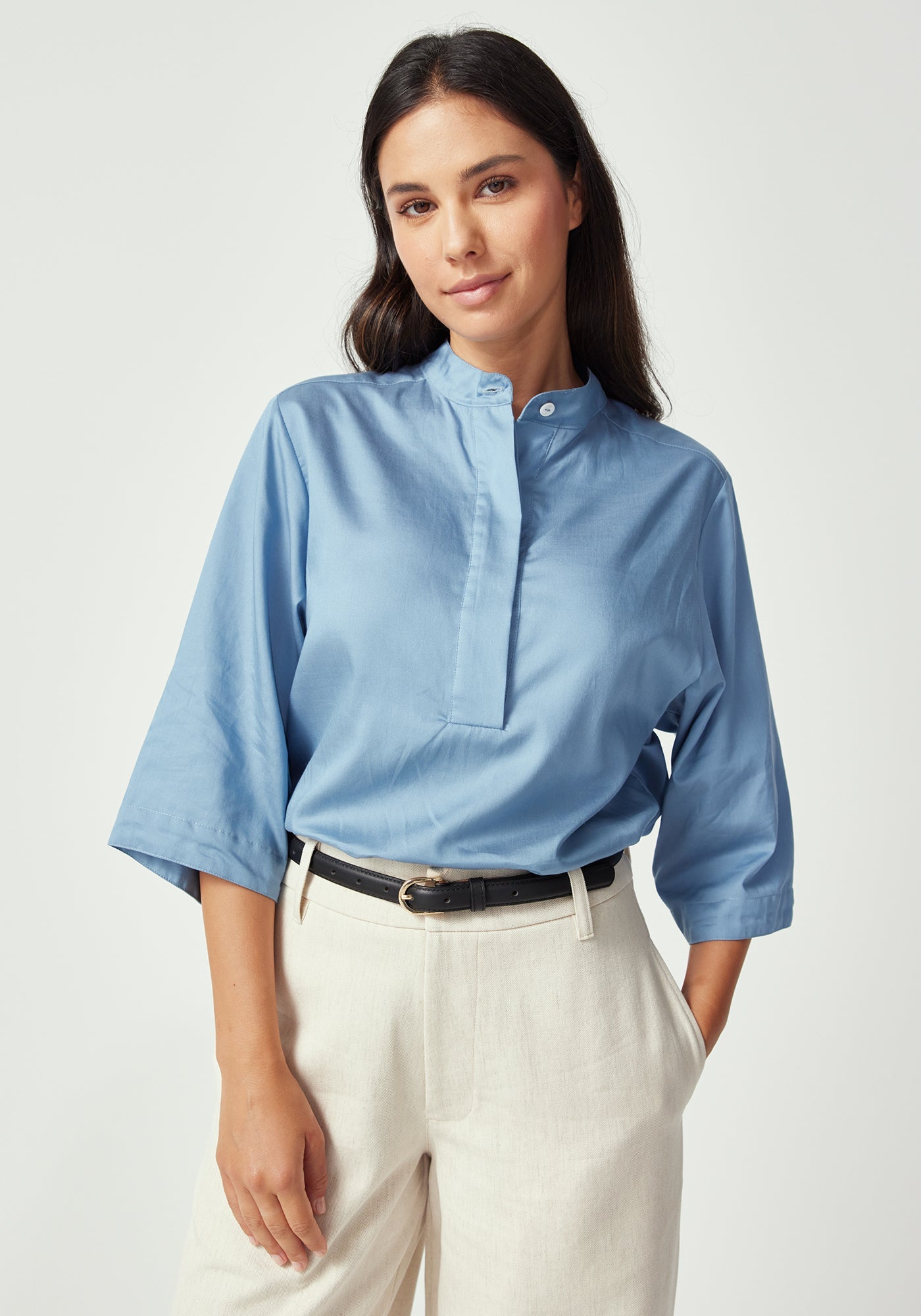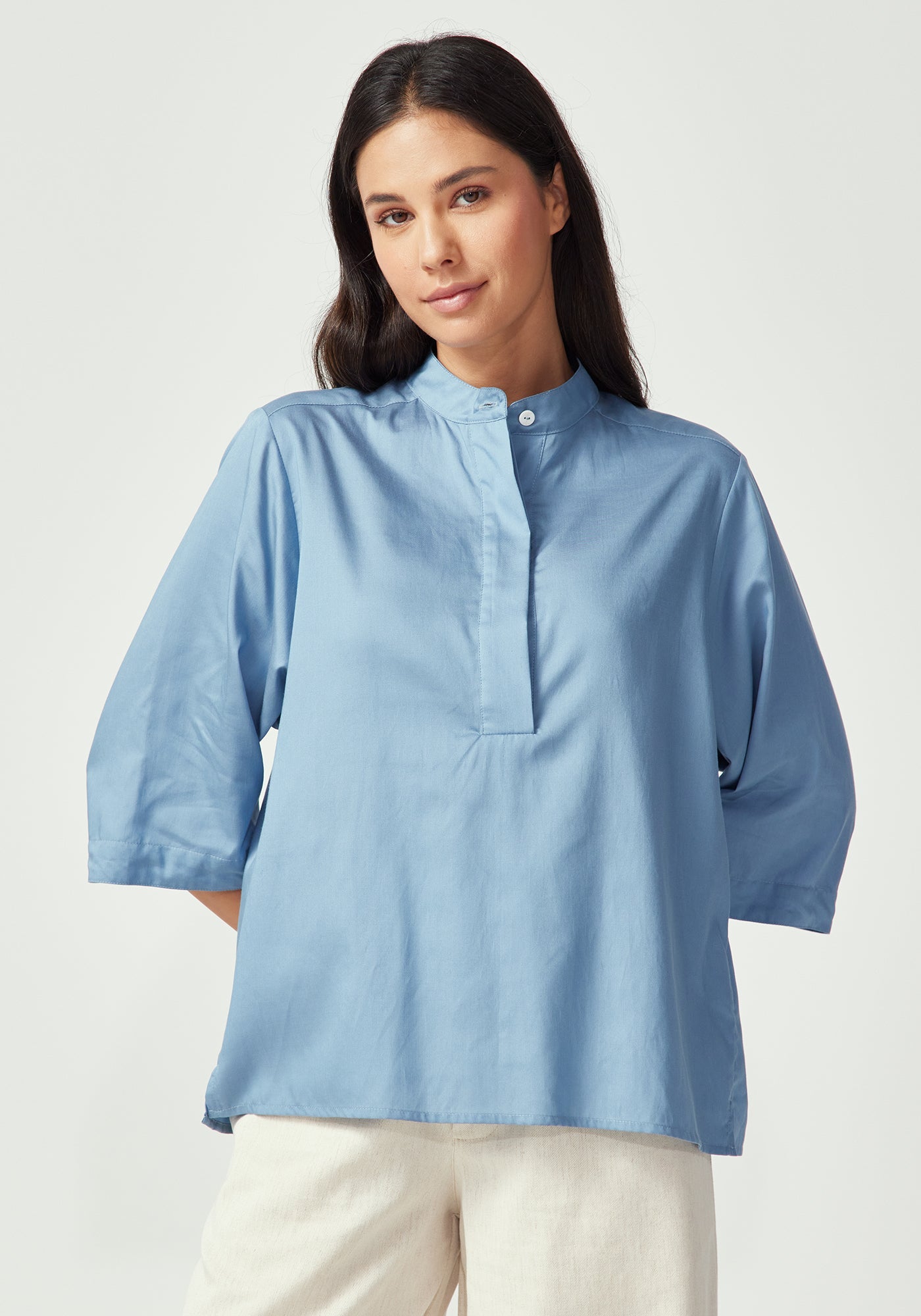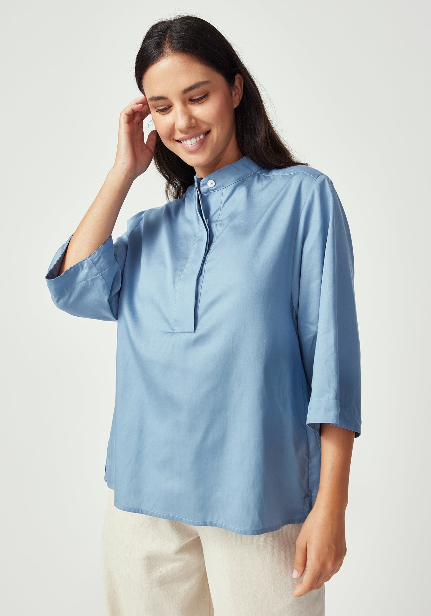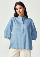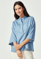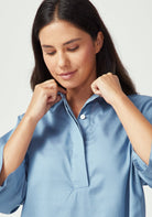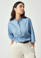 Elevate your wardrobe with this beautifully crafted shirt that combines timeless design with modern comfort. Made from a luxurious blend of 63% TENCEL™ and 37% cotton, this three-quarter sleeve piece offers the perfect balance of silky smoothness and natural breathability.