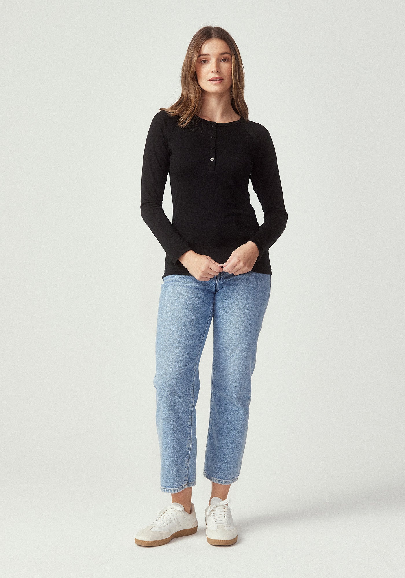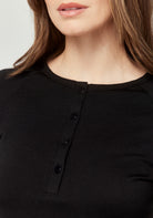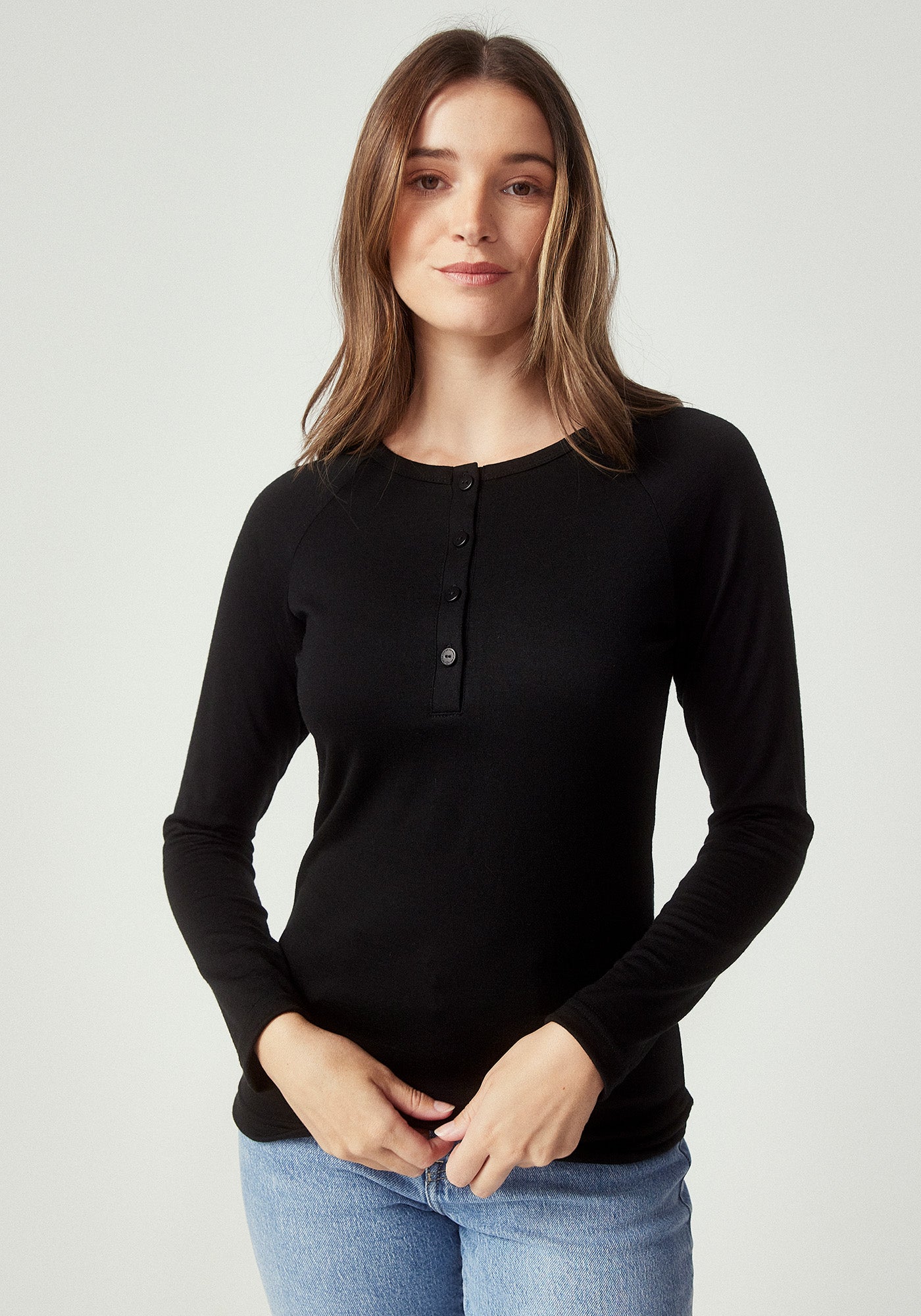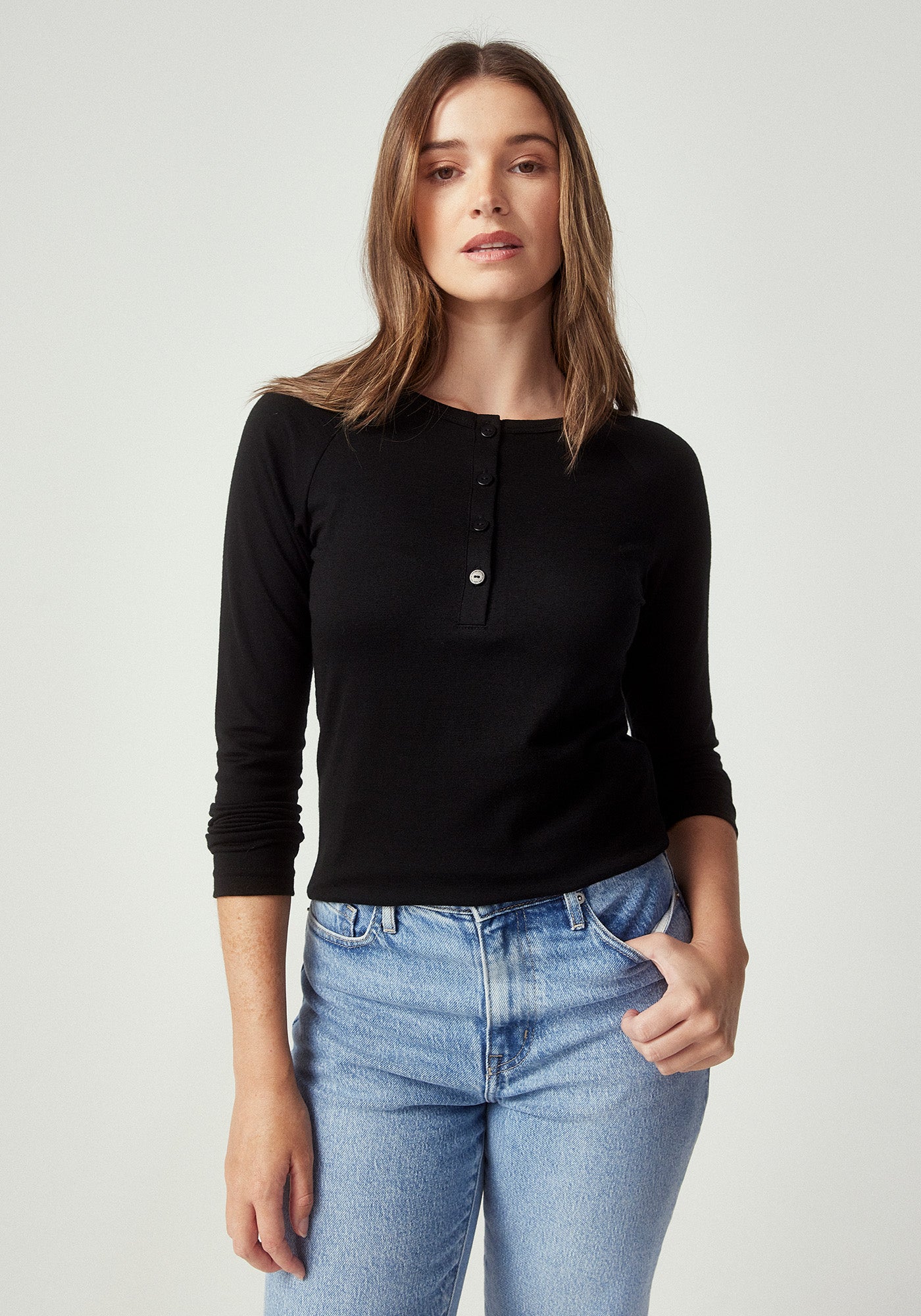 Soft against the skin and naturally breathable, it offers just the right amount of warmth, making it perfect for transitional layering or wearing on its own. Its close fit flatters the form without feeling restrictive, skimming the body with intention. A ¾ button-down neckline adds a gentle nod to classic Henley styling, while allowing you to wear it open or closed depending on the day (or the mood).