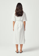 The Manon Dress elevates the classic shirt dress with a sophisticated textured check pattern. Featuring a relaxed collar, comfortable short sleeves, and full button-front closure, this midi-length piece offers versatile styling options. Wear it belted for a defined silhouette or loose for effortless ease. The practical side pockets and adjustable tie belt make this dress as functional as it is beautiful, while the crisp White/Flax Check pattern brings timeless appeal with a modern twist.