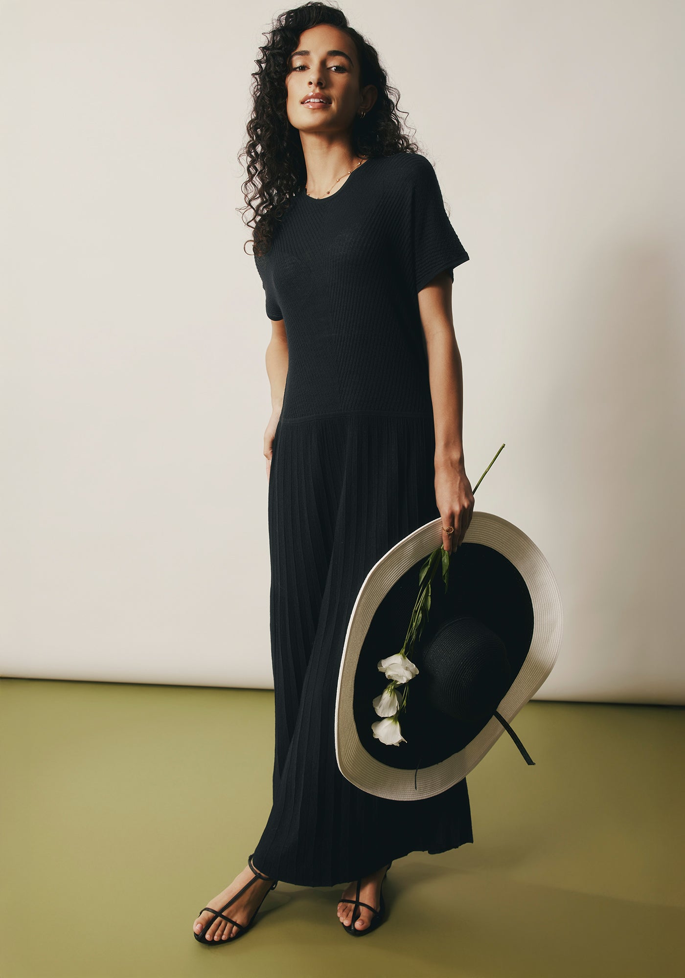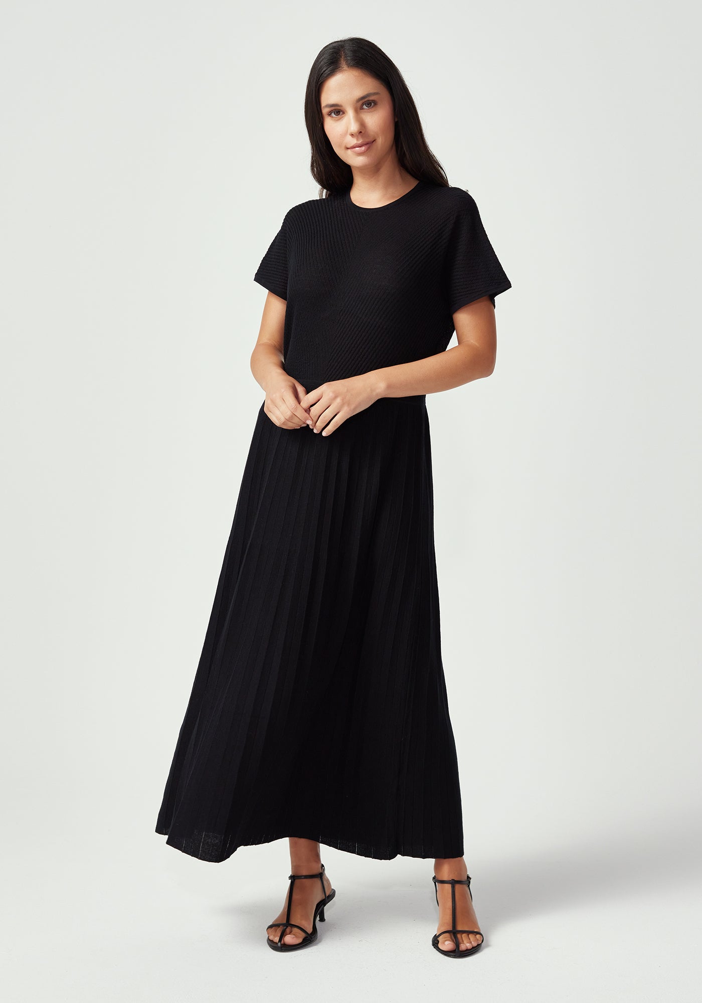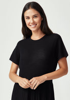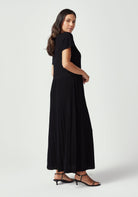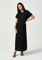The Aloe Dress redefines casual elegance with its flowing maxi silhouette and understated sophistication. Featuring a classic crew neckline, textured top like the haze tee, and a pleated skirt that moves beautifully with every step, this dress offers effortless style for any occasion. The relaxed fit through the body ensures all-day comfort, while the ankle-length hem creates an elongated, flattering silhouette. In versatile black, this piece transitions seamlessly from day to evening, and pairs beautifully with everything from sneakers to sandals and heels.