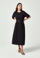 With its clean, minimalist silhouette and versatile midi length, the Nero Dress is designed for the woman who values both style and comfort. Featuring a classic crew neckline, short t-shirt style sleeves, and a relaxed fit through the body, this simple yet refined design is endlessly versatile. Wear it belted for a more defined silhouette or loose for casual elegance. Crafted from 100% Good Earth Cotton, this dress embodies our commitment to regenerative agriculture and soil health.