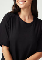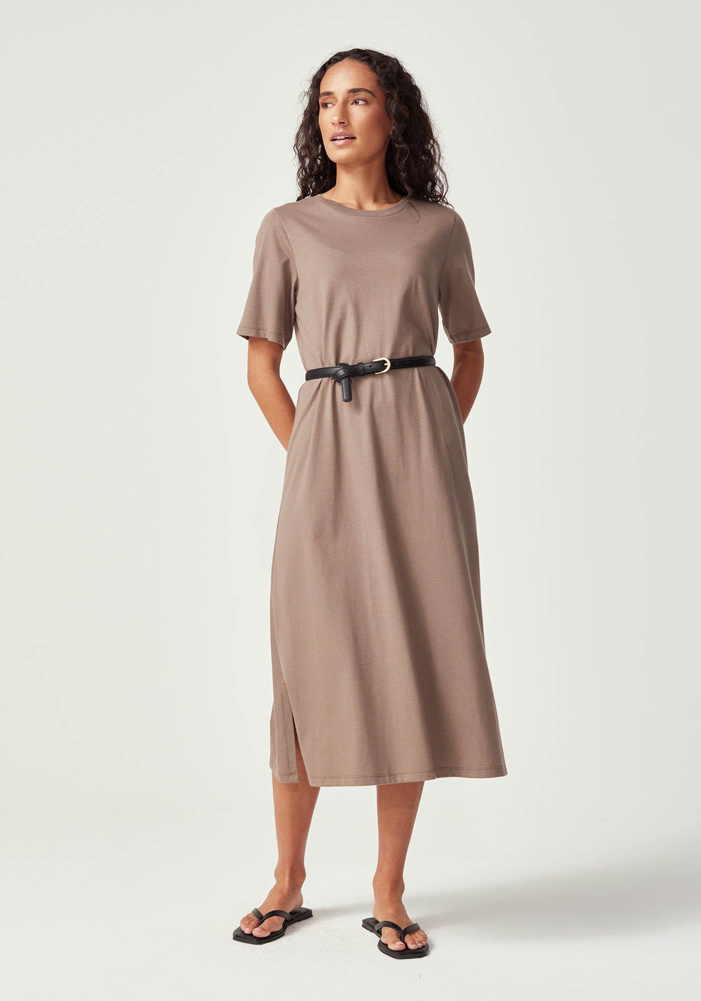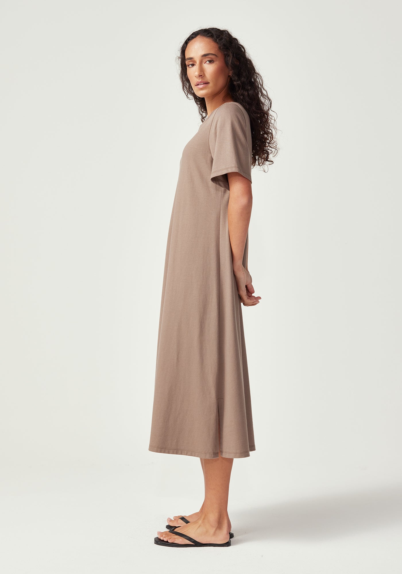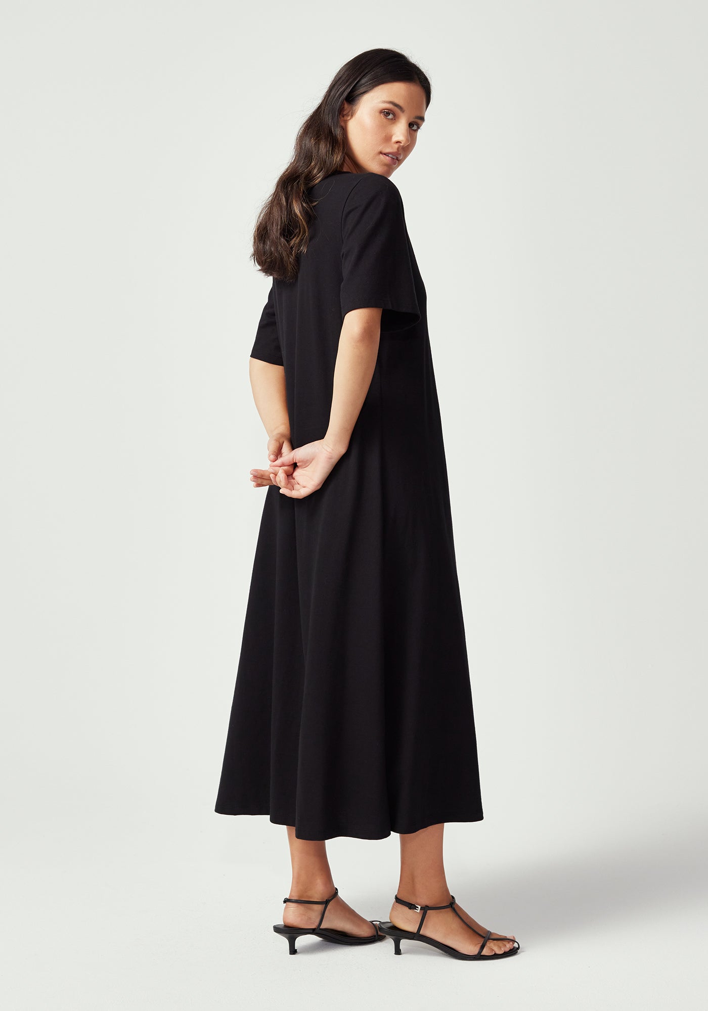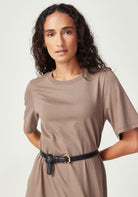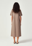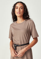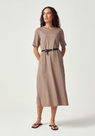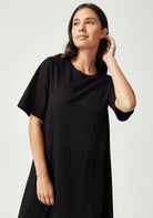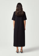 With its clean, minimalist silhouette and versatile midi length, the Nero Dress is designed for the woman who values both style and comfort. Featuring a classic crew neckline, short t-shirt style sleeves, and a relaxed fit through the body, this simple yet refined design is endlessly versatile. Wear it belted for a more defined silhouette or loose for casual elegance. Crafted from 100% Good Earth Cotton, this dress embodies our commitment to regenerative agriculture and soil health.