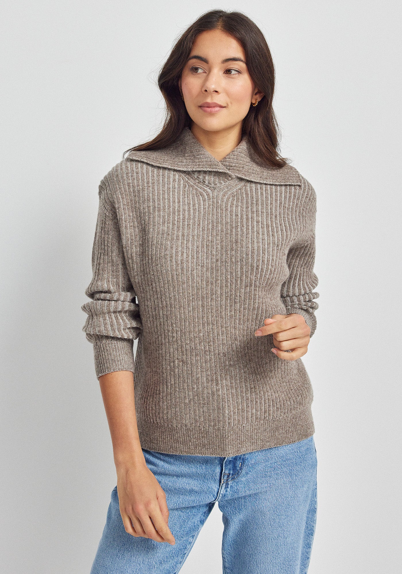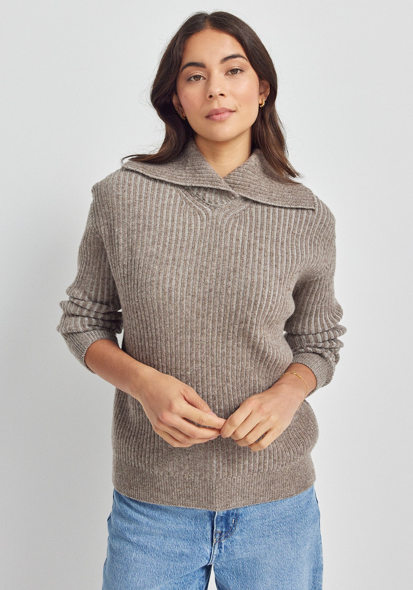 The wide, sculptural collar rests gently across the shoulders, and can be pulled up for extra warmth and layered over a coat, or worn high when the weather turns.